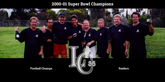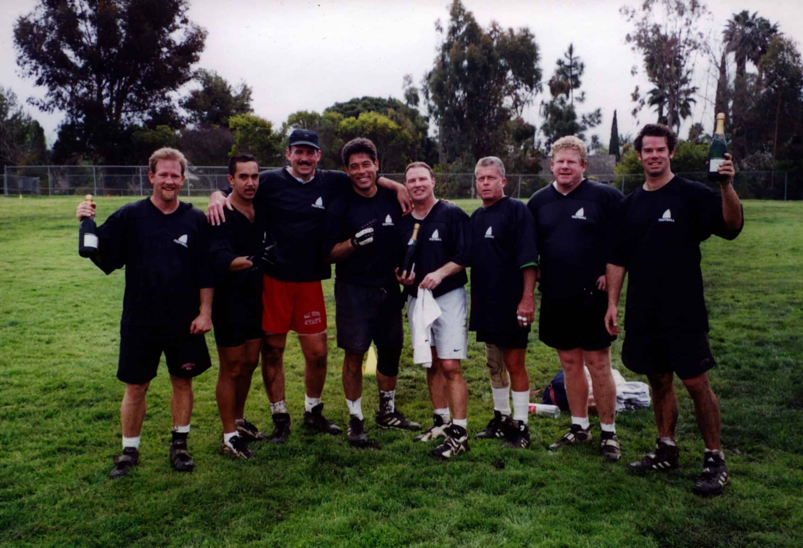 2000-01 Champions: Raiders. Team Photo (l to r): Dan Watts, Jose Rivera, John Orendain, Jim Romaine, Phil Spencer (QB/Captain), Randy McAdams, Doug Zirbel, & Wade Griffis. Not in photo: Jeff Niemi.