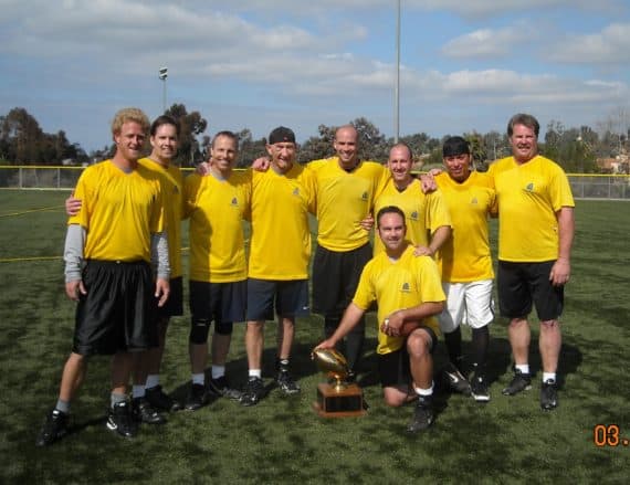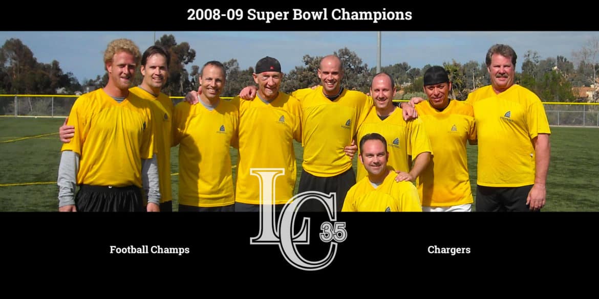 2008-09 Football Home ⟩ Leagues ⟩ Football ⟩ 2008-09 Football Congratulations to the 2008 Super Bowl Winners! 2008-09 Super Bowl Champs – Chargers 2008-09 Champions: Chargers. Team Photo. Kneeling with trophy: Arnold Berger (QB/Captain). Standing (l to r): Charlie Hodil, Mark Mattingly, Jim MacGregor, Tony Fodor, Josh Wright, Andres Cherner, Kevin Coon, & Barry Blanchard.