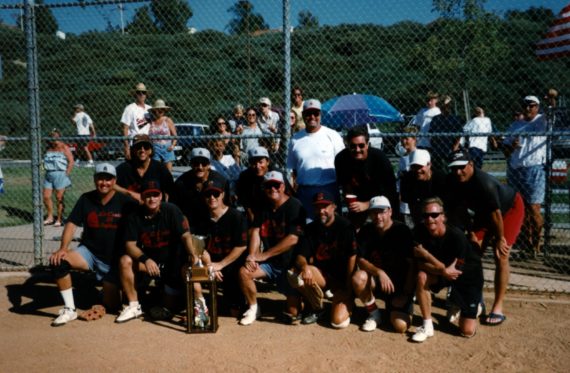 Team Photo front row (l to r): Eric Olson, Jack Wick (Manager), Frank Kuzniar, Steve Reeves, Mike Evans, Jeff Turner, & Jeff Sobieski. Back row (l to r): Rob Carpenter, Ed Shoen, Don Pastalaniec, Mike Prosser (White shirt, scorekeeper), Ron Wrigley, Unidentified, & Steve Garrison. Unidentified or not in photo: Jim Traber, Mike Hill.