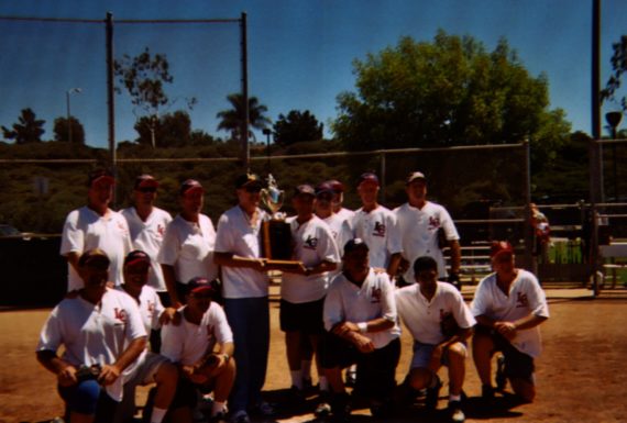 2004 Over-50 Champions: Rancho Santa Fe Pharmacy Bombers. Team Photo front row (l to r): Larry Silvett, Alan Fischer, Bobby Van Epps, Chuck Blomberg, Paul Yezbek, & Mike Glass. Back row (l to r): Alan Nyheim, Jim Teeter, Bob Graul, Rich Chilingirian, Joe Kechter, Tom Kelly, Henry Vanderweit, & Bob Raasch. Not in photo: Bernie Vitek (Manager).